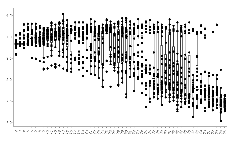 Having access to fluorophore reference signatures as part of my Luciernaga R package, I started working on some code that when given a certain number of fluorophores, it would randomly select that many non-identical fluorophores from the available reference signatures. These would be added to the unmixing matrix, and then the single-color unstained control would be unmixed with that matrix. Finally, a stain index measurement would be calculated from the unmixed single-color control to measure separation of the positive from the negative. Then this process would be repeated 20 times with different combination of reference signatures. I then iterated the data-generation process from 2 to 55 fluorophores in the unmixing matrix, getting these pretty results 😍